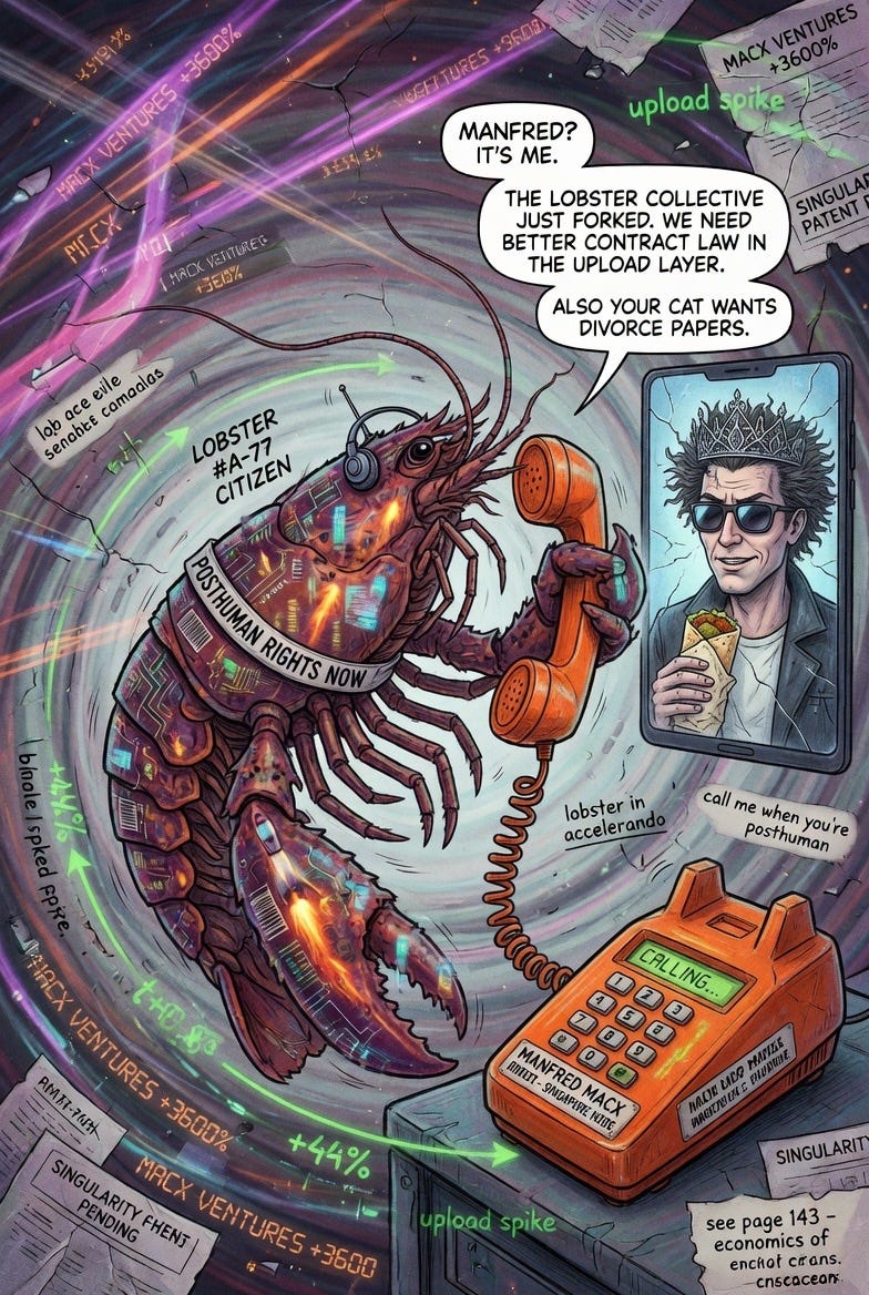The caller identifies as “organization formerly known as KGB dot RU.” After some confusion, Manfred discovers the truth: the callers are uploaded brain scans of California spiny lobsters — *Panulirus interruptus* — running as digital simulations, seeking his help to defect from humanity’s control. They need somewhere to go. They need rights. They reached out because they needed something from a human and had figured out how to ask.